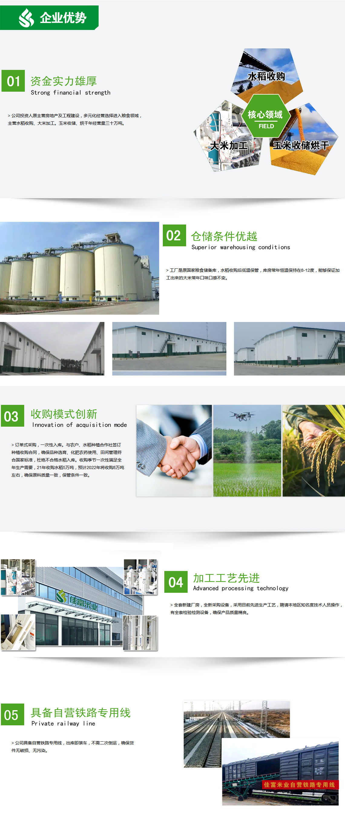 吉林省佳富米业有限公司成立于2021年4月,公司是一家集水稻种植、粮食收购、大米加工销售于一体的新型民营企业。公司坐落于吉林省长春市九台区原营城粮食储备库 ,注册资金2000万元,厂区面积18万平方米,具备国家标准粮食储备库26座,仓储能力13万吨,大米加工车间2112平方米,有铁路专用线两条,目前有员工118人,高端管理及技术人员28人。     公司引进国内先进技术的成套大米生产线和检验设备,全套生产线由清粮机、去石机、脱壳机、精米机、色选机、白米分级筛,电子计量称组陈。保证生产 的大米全程无污染,米质晶莹剔透,无杂质,无异色粒。日生产水稻能力300吨;批处理水稻量60吨;水稻存储能力30000吨;拥有自主大米商标有“巧米乡”,“禾添福” ,“吉九佳富”,“祝禾佳富”等。     公司自成立以来积极探索现代农业产业化经营模式,形成以“龙头企业+合作社+农户”的模式,在企业发展运行中取得显著成效。公司基地的稻米一年只熟一 季,播种过程中采用人工播种,锄草,收割,力争从土地到餐桌,从源头抓起,层层监管,严把质量,让每一个家庭吃到放心米。     “民以食为天,食以安为先” 展望未来,任重而道远,吉林省佳富米业有限公司将以人类健康为永恒己任,“以信誉求生存,以质量求发展”的服务宗旨,为消 费者提供安全、营养、高品质的产品,为人类健康事业做出贡献。